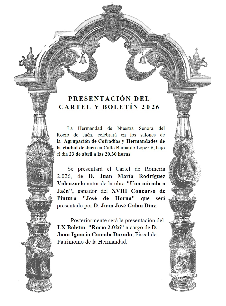 Presentación Cartel y Boletín 2.02614 abril, 2026Escrito por Administrador El próximo Viernes 23 de abril a las 20.30h en la sede de la Agrupación de Cofradías y Hermandades de la ciudad de Jaén, calle Bernardo López 6 bajo, tendrá lugar la presentación del Cartel y Boletín Rocío 2.026