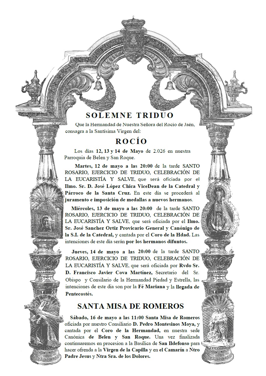 Cultos en Hornor a Mª Santísima del Rocío14 abril, 2026Escrito por Administrador Información del Triduo y Misa de Romeros para el próximo mes de mayo.