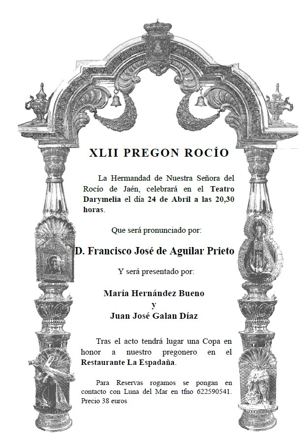 El Próximo viernes 24 de abril de 2026 a las 20,30h tendrá lugar el XLII Pregón de la Hermandad del Rocío de Jaén en el Teatro Darymelia de la ciudad de Jaen, que será pronunciado por D. Francisco José de Aguilar Prieto y será presentado por Dª María Hernández Bueno y D. Juan José Galán Díaz.